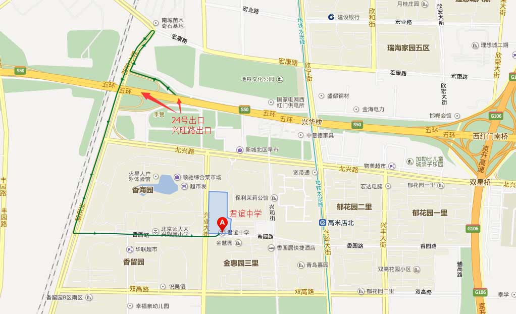 学校紧邻南五环24号出口——兴旺路出口,兴旺路出口掉头,向南直行到第二个红绿灯左转,直行到第三个红路灯即到我校。