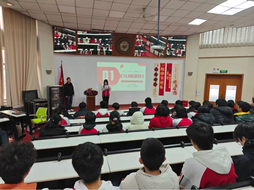 九十年前,北平街头的呐喊划破长夜,青年学子以血肉之躯扛起民族救亡的重任;九十年后,菁菁校园里的誓言响彻云霄,少年意气以赤子之心传承爱国奋进的火种。为纪念一二·九运动90周年,厚植家国情怀,高一年级隆重召开“弘扬一二·九精神,争做新时代好青年”主题纪念大会,全体师生齐聚一堂,在回望历史中汲取力量,在庄严承诺中勇担使命。本次大会由高一年级组长董凯荣老师主持。
